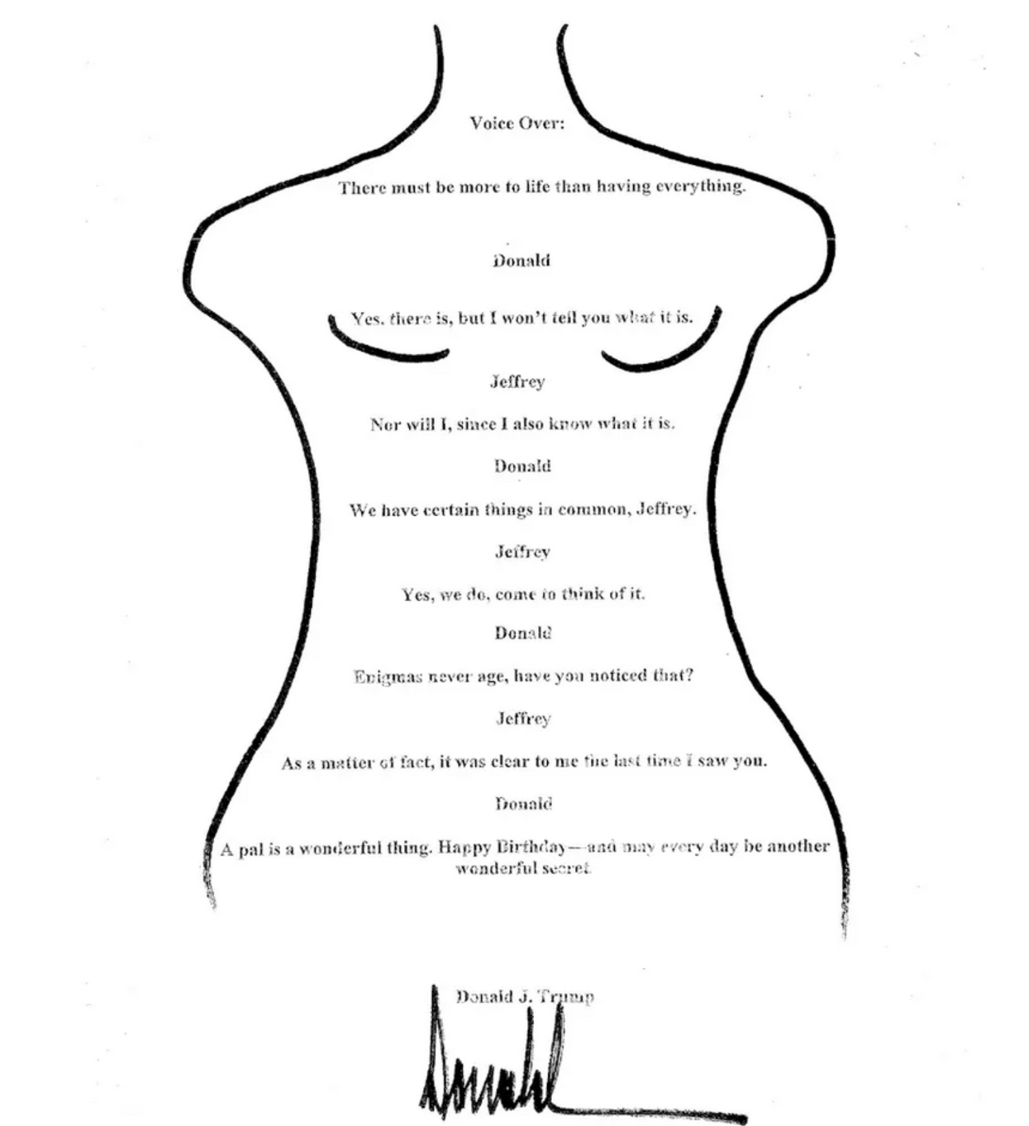 Yazının tamamı ise çıplak bir kadın vücudu çiziminin üzerine yazılmış. Bu çizimin Donald Trump tarafından yapıldığı iddia ediliyor. Diyalog “Mutlu yıllar ve her gün başka bir sır olsun” cümlesiyle bitiyordu.
