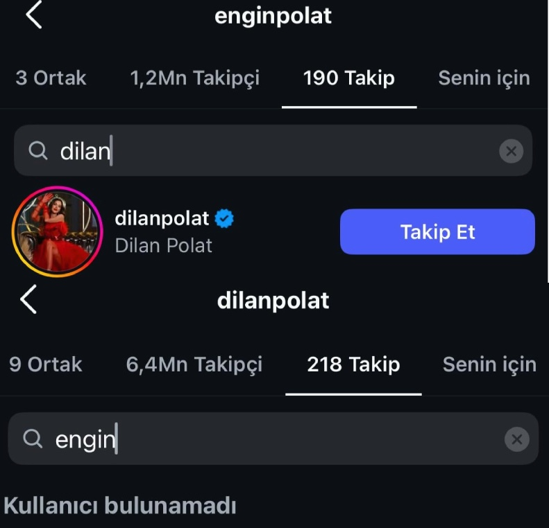 Dilan Polat’ın, tüm bu paylaşımların öncesinde eşi Engin Polat’ı Instagram’dan takipten çıkması da dikkat çekti. Dilan Polat, Engin Polat’ı takipten çıkarken; Engin Polat’ın, Dilan Polat’ı takipten çıkmadığı görüldü.