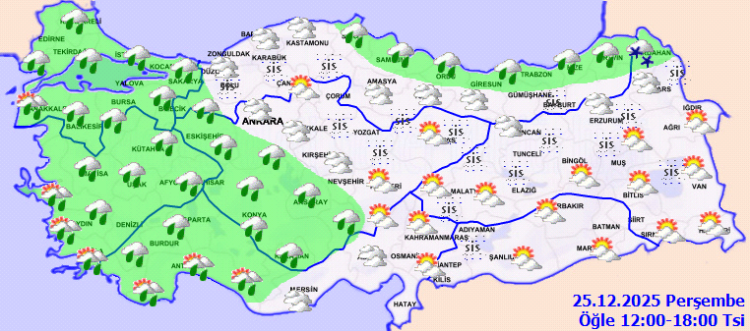 ANKARA (İGFA) – Meteoroloji Genel Müdürlüğü, 25 Aralık Perşembe gününe ilişkin hava tahmin raporunu yayımladı.