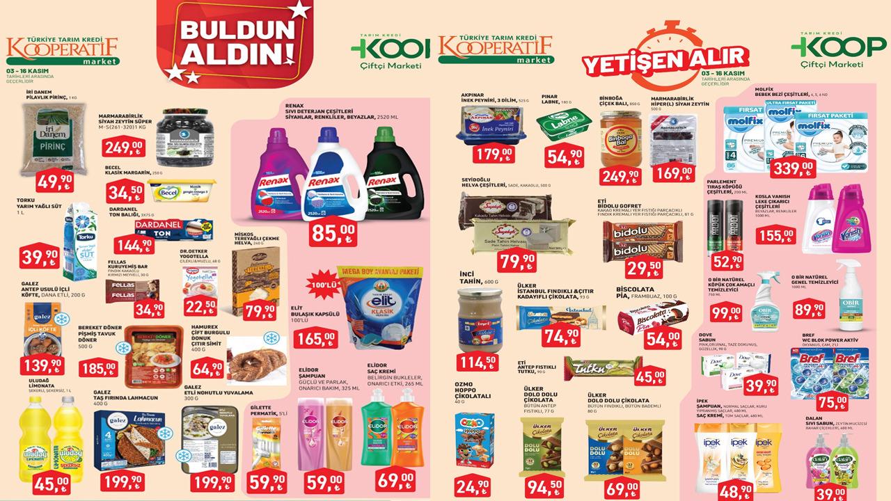 Tarım Kredi Market’te 3 Kasım tarihinde başlayacak ve 16 Kasım’a kadar devam edecek olan kampanyasında; şampuan ve saç kremi, genel temizleyici, çok amaçlı temizleyici, leke çıkarıcı çeşitleri, çiçek balı, inek peyniri, tahin, ton balığı, yarım yağlı süt, siyah zeytin, kuruyemiş bar, tıraş köpüğü çeşitleri, bebek bezi çeşitleri indirimli fiyatlarla satışa sunulacak.